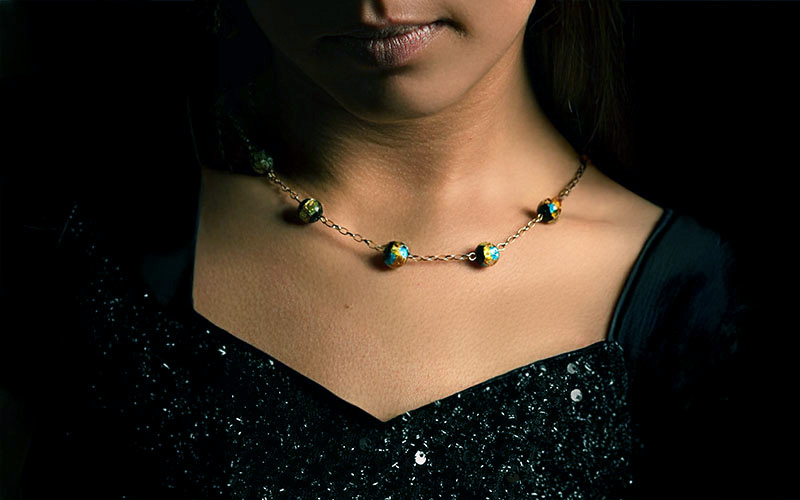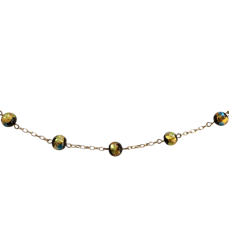Les perles, aux reflets mêlés d’or, de bleu profond et de noir, capturent la lumière comme des fragments d’étoiles. Leur éclat discret se révèle dans le mouvement, créant un jeu de lumière raffiné et mystérieux.