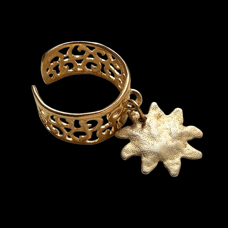 Son anneau ajouré aux arabesques délicates, doré à l’or fin, épouse le doigt avec légèreté. En suspension, un médaillon Soleil martelé capte la lumière et la diffuse avec douceur, évoquant un astre ancien gravé dans le métal.