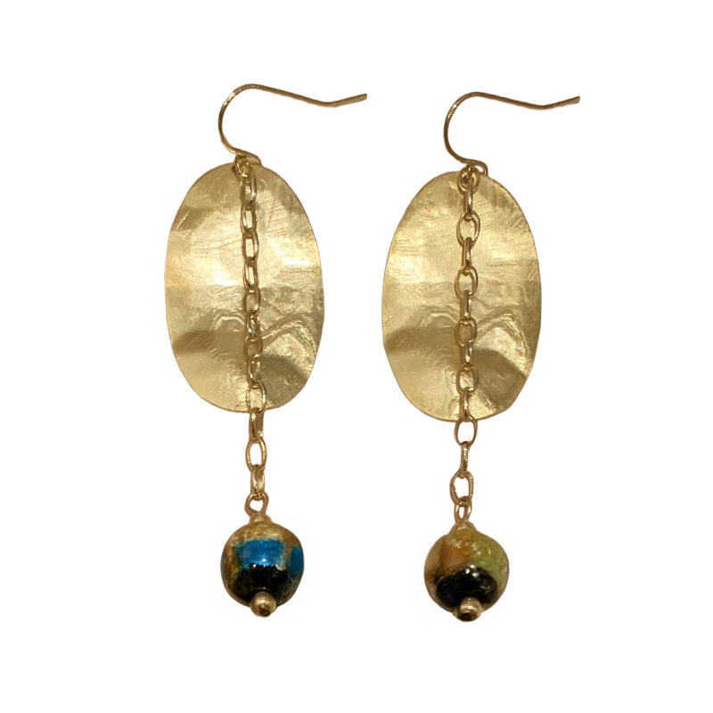 Motif ovale martelé (32 × 20 mm), chaîne fine d’environ 5 cm, crochets finition or