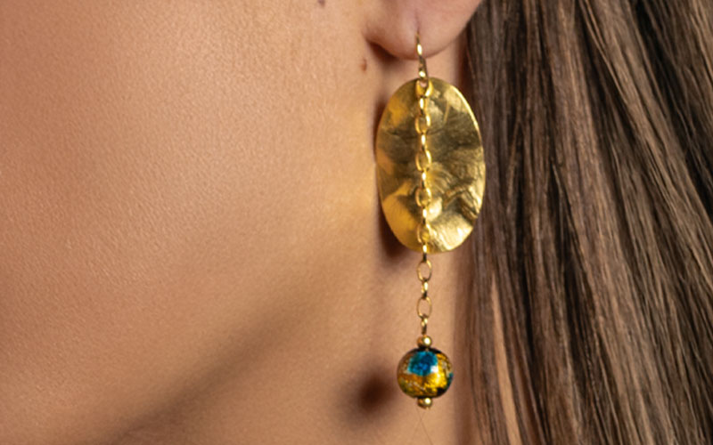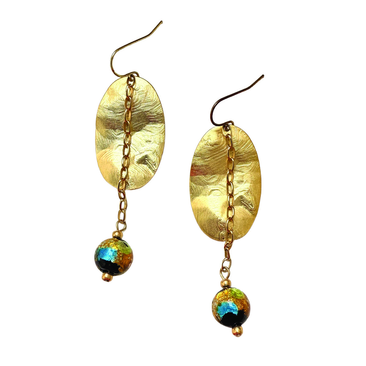 Boucles d’oreilles GAMMA composées d’un motif ovale martelé doré à l’or fin mat et d’une Perle Luciole de 8 mm suspendue à une chaîne. Une création délicate et lumineuse, inspirée de l’élégance céleste de Cassiopée.