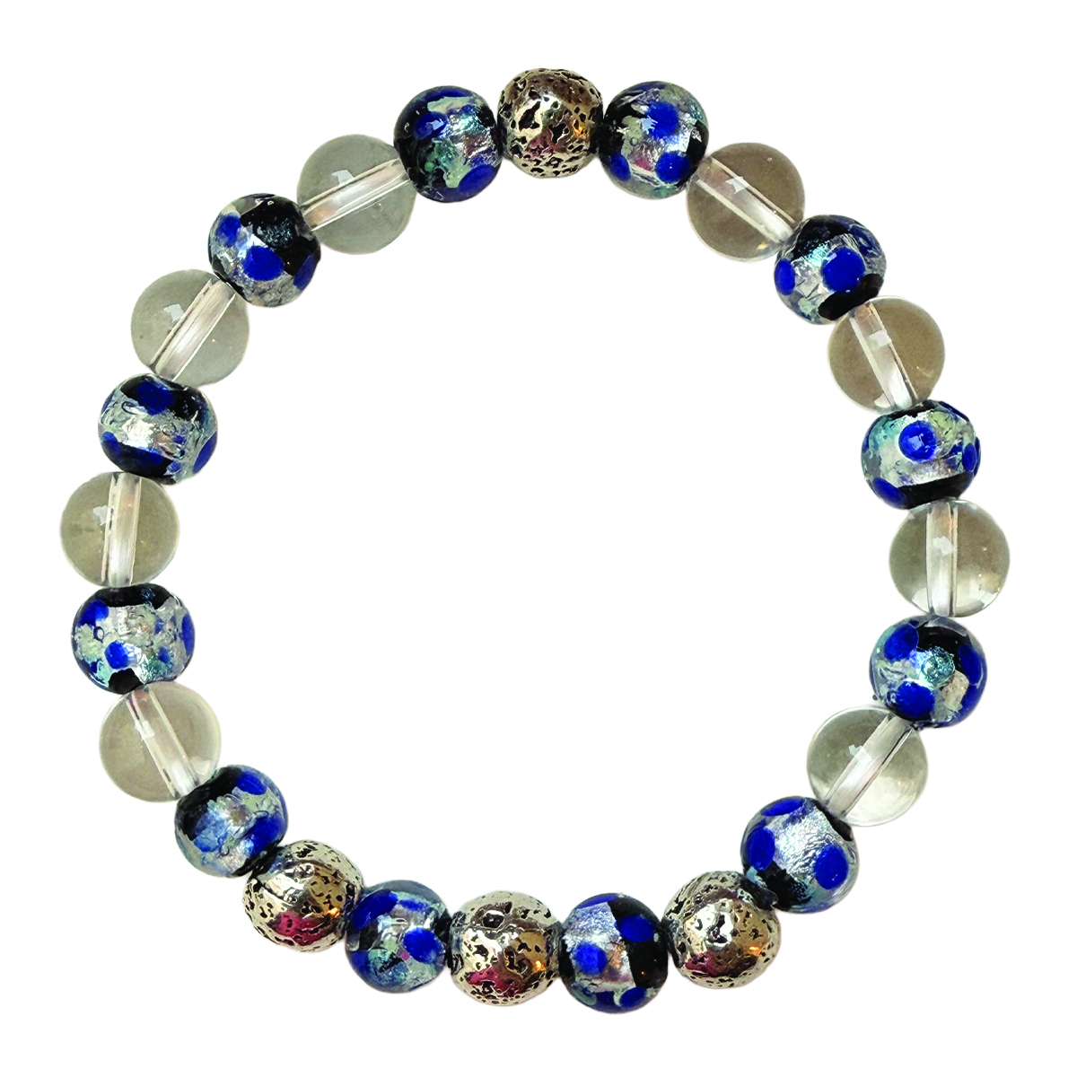 Composé de perles en verre artisanal bleu tacheté, de perles métalliques argentées finement ajourées et de perles translucides en cristal de roche, il crée un jeu de lumière délicat et élégant autour du poignet.