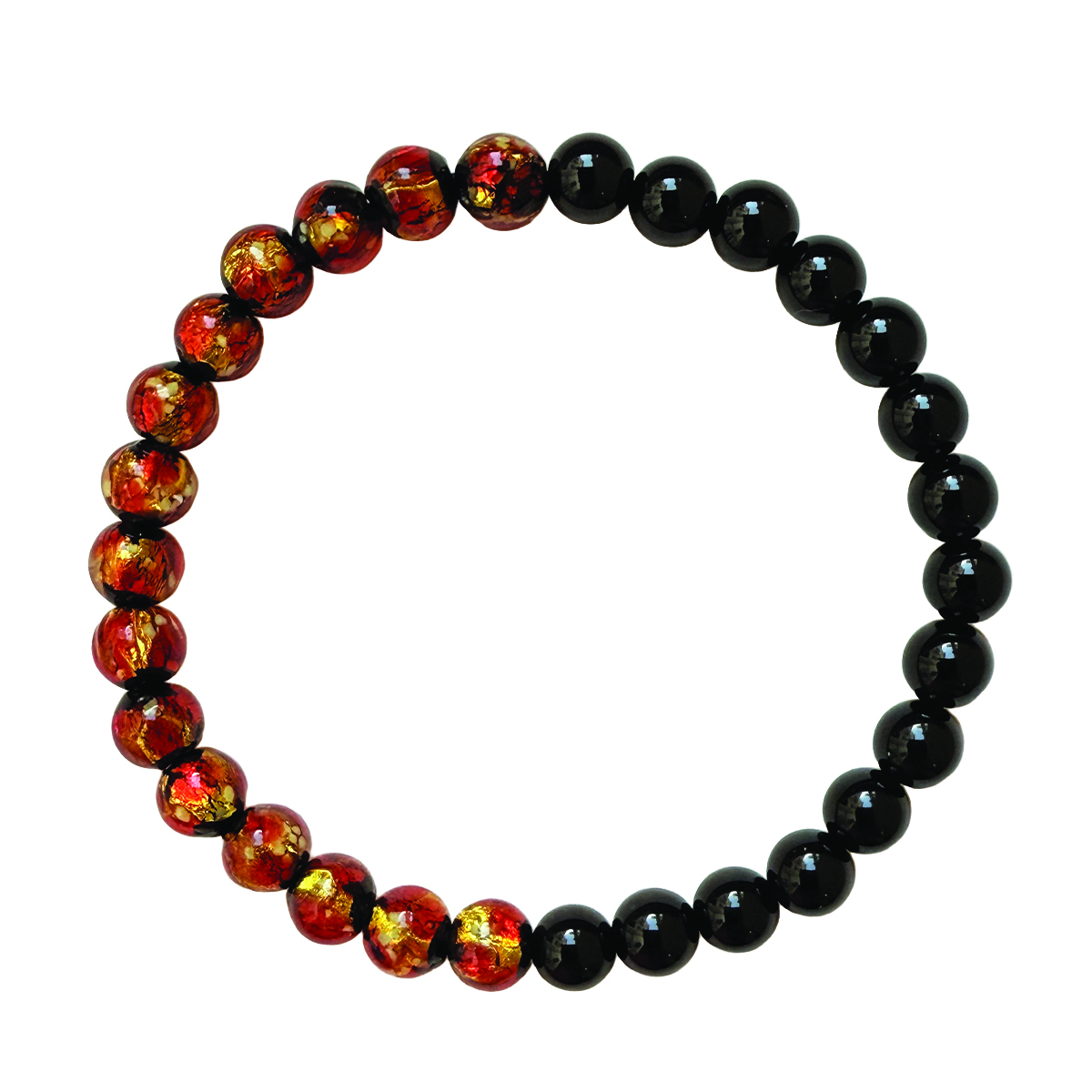 ÉCLIPSE joue avec la lumière et l’ombre. L’onyx noir crée une ligne sophistiquée et graphique, tandis que les perles lucioles photoluminescentes dorées et rouges apportent une chaleur vibrante.