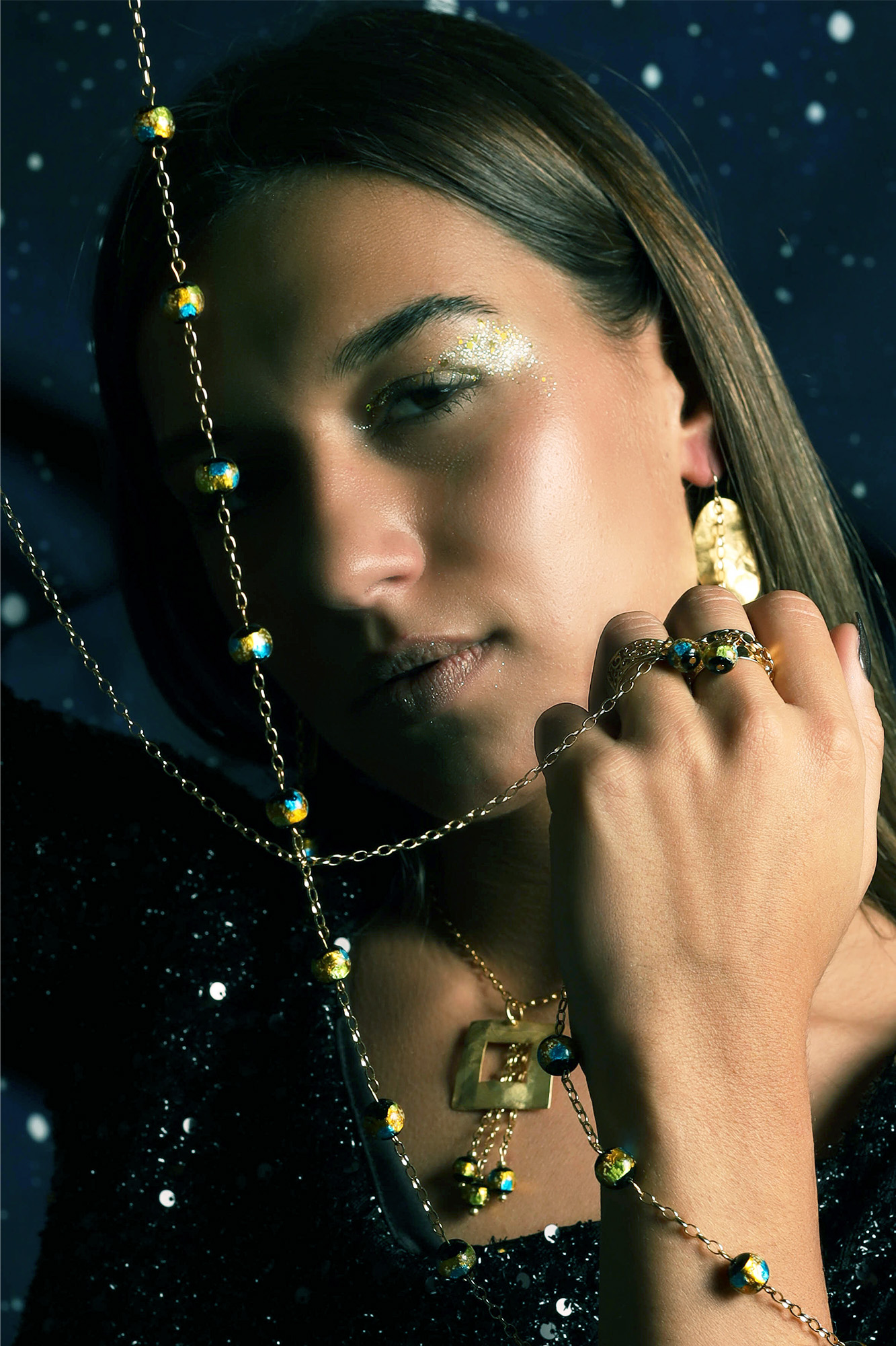 Les perles, aux nuances profondes mêlant noir, or et reflets bleutés, capturent la lumière comme une constellation en mouvement. Chaque éclat apparaît et disparaît au gré des gestes, révélant une luminosité subtile et presque secrète.