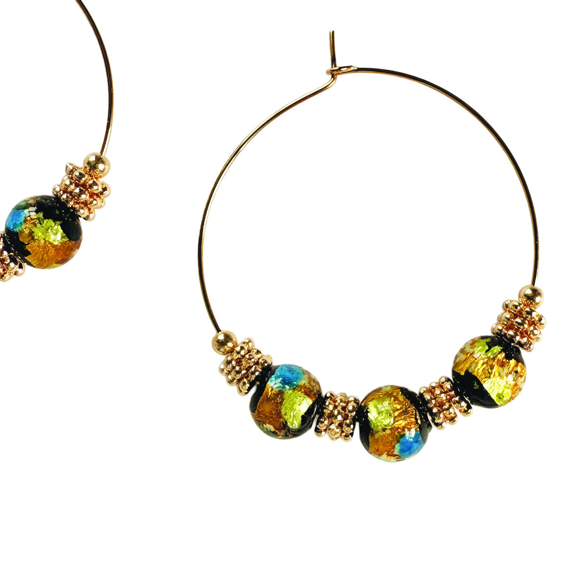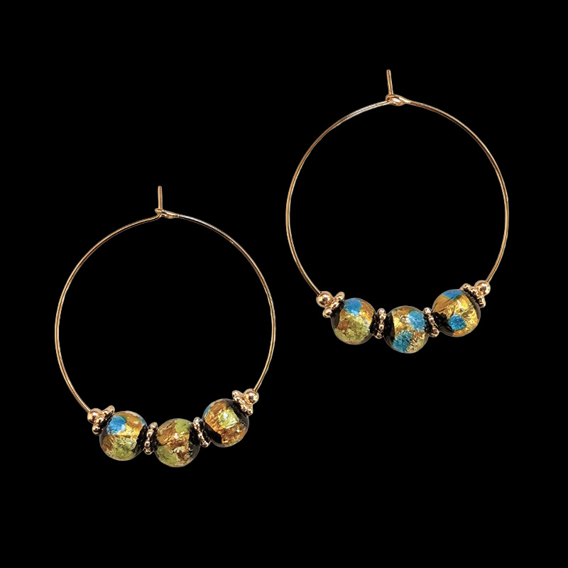 Entre chaque perle, de fines rondelles dentelées dorées à l’or fin viennent rythmer la composition, soulignant délicatement la lumière et apportant un éclat précieux, presque astral. À chaque mouvement, les créoles accompagnent le geste avec douceur, laissant apparaître une lueur subtile et mouvante.