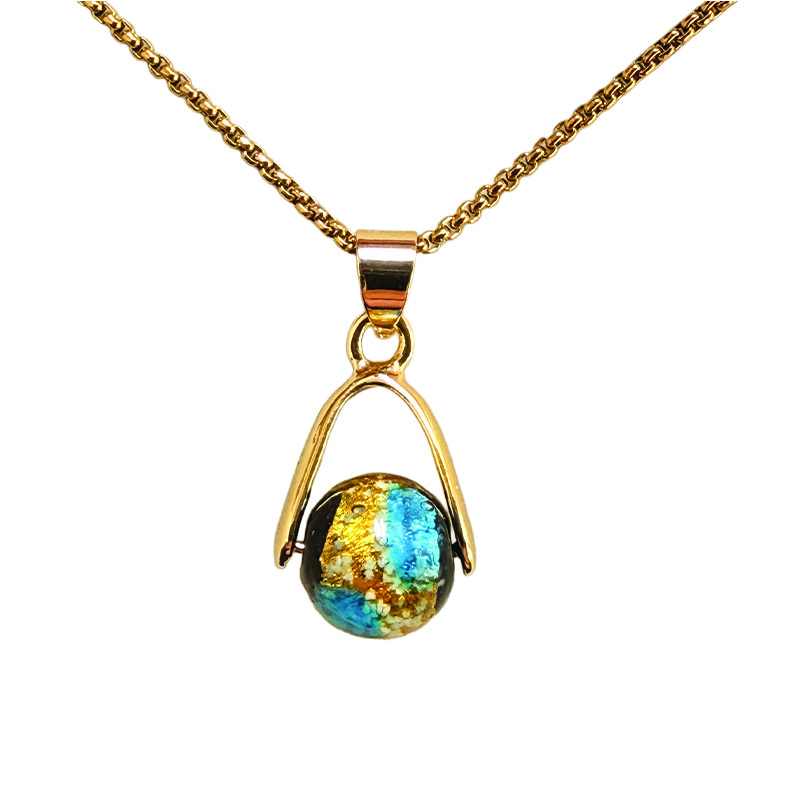 Chaîne acier argenté ou doré, perle en verre au reflets lumineux or, bleu et noir